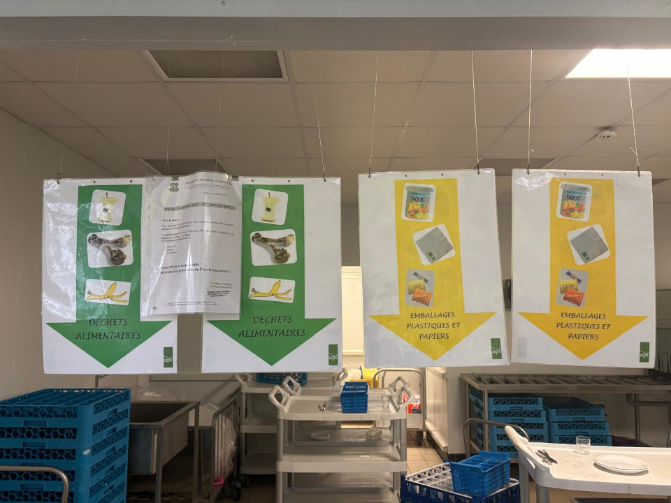 Les plateaux sont débarrassés et triés par les élèves eux-mêmes ; les déchets alimentaires sont collectés dans un container spécial.
